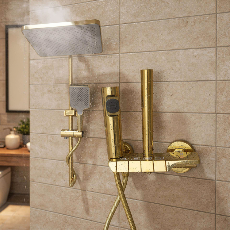 شامل سر دوش ثابت (بارانی) با طراحی مربع، سر دوش دستی با شلنگ، و شیرآلات کنترل جریان و دما [1، 6].