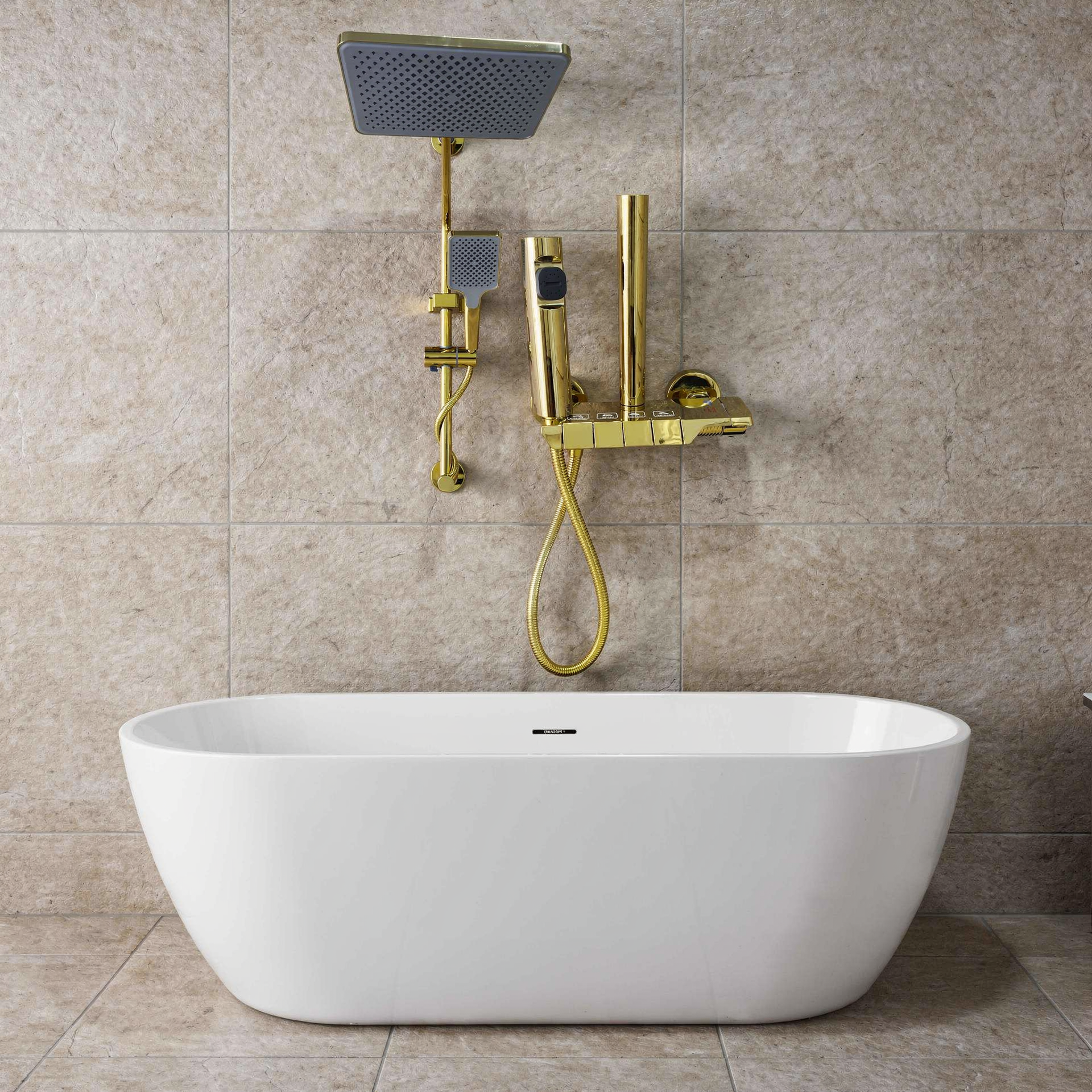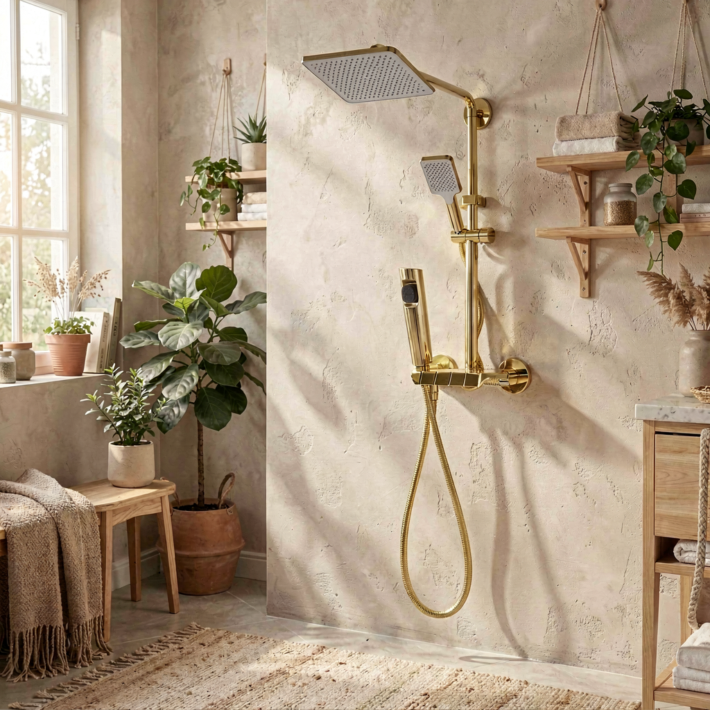 شامل سر دوش ثابت (بارانی) با طراحی مربع، سر دوش دستی با شلنگ، و شیرآلات کنترل جریان و دما [1، 6].