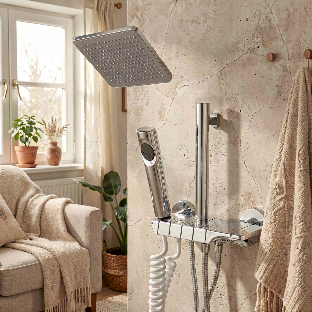 مدل: 99111D رنگ/جنس: کروم (Chrome) نوع نصب: دیواری اجزاء: شامل سر دوش بارانی مربعی، گوشی دوش دستی، شیلنگ، و شیرآلات کنترل آب.